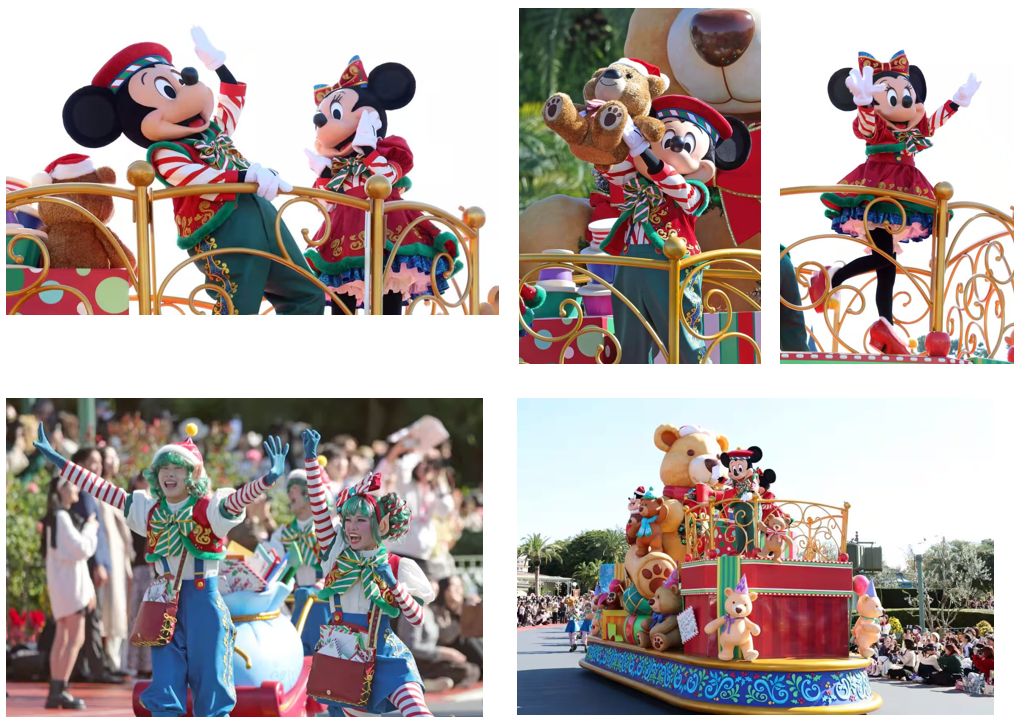 パレードには、ミッキーマウスやミニーマウスをはじめとするディズニーの仲間たちが登場。クリスマスの飾りをまとったテディベアやくるみ割り人形の音楽隊など、にぎやかなキャラクターたちが盛り上げる。子供たちの願いがかない、パークが笑顔で満ちたとき、サンタクロースと仲間たちは喜び合い、心温まるマジカルなクリスマスがクライマックスを迎える。