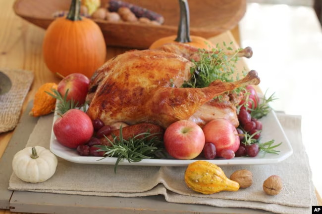 The turkey is cooked in an oven for many hours, often with a mix of celery, bread, onions and spices inside the bird. This mix becomes stuffing -- another star of the Thanksgiving dinner table.